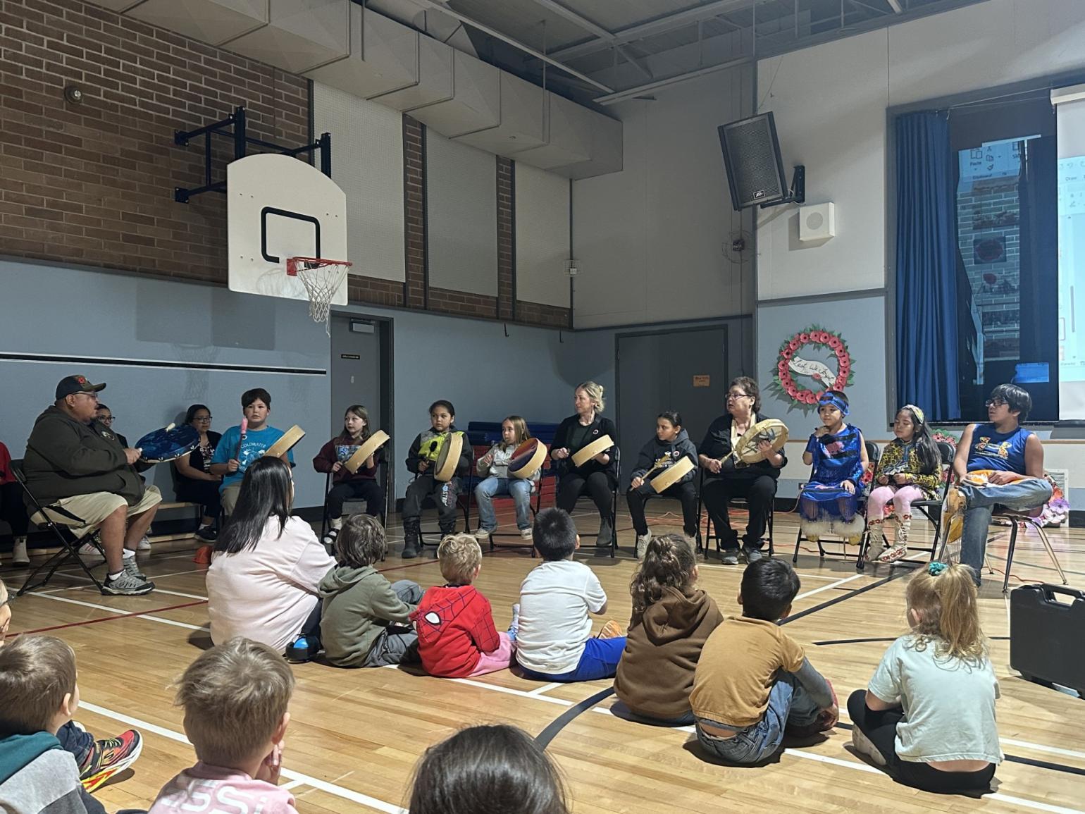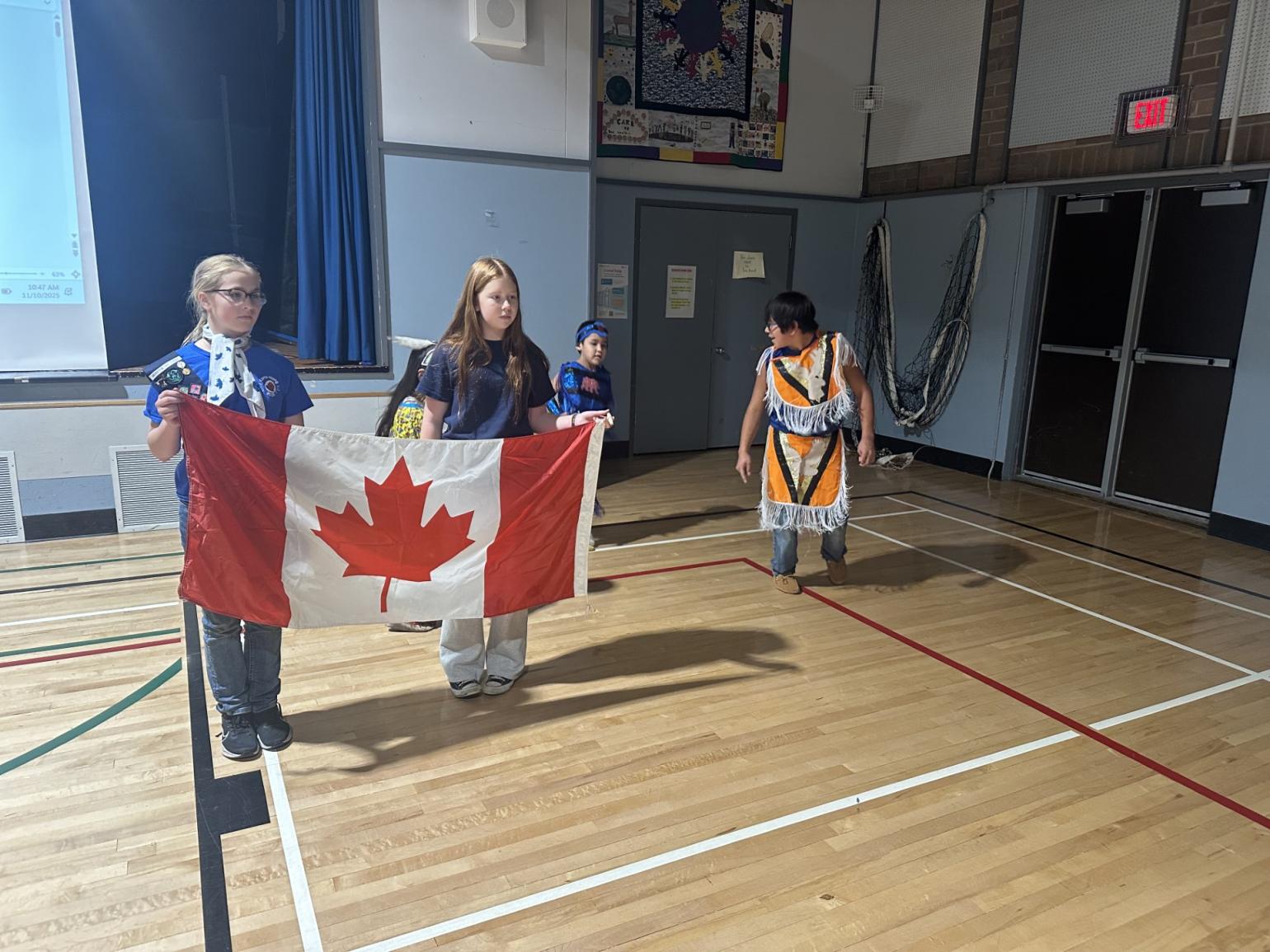 Our ceremony was deeply child-centered, with students leading many parts of the program and sharing their voices in meaningful ways. It began with a powerful entrance: Indigenous student dancers and our colour guard marched into the gymnasium to the steady beat of our school drum group. This set a tone of respect and unity for the day.