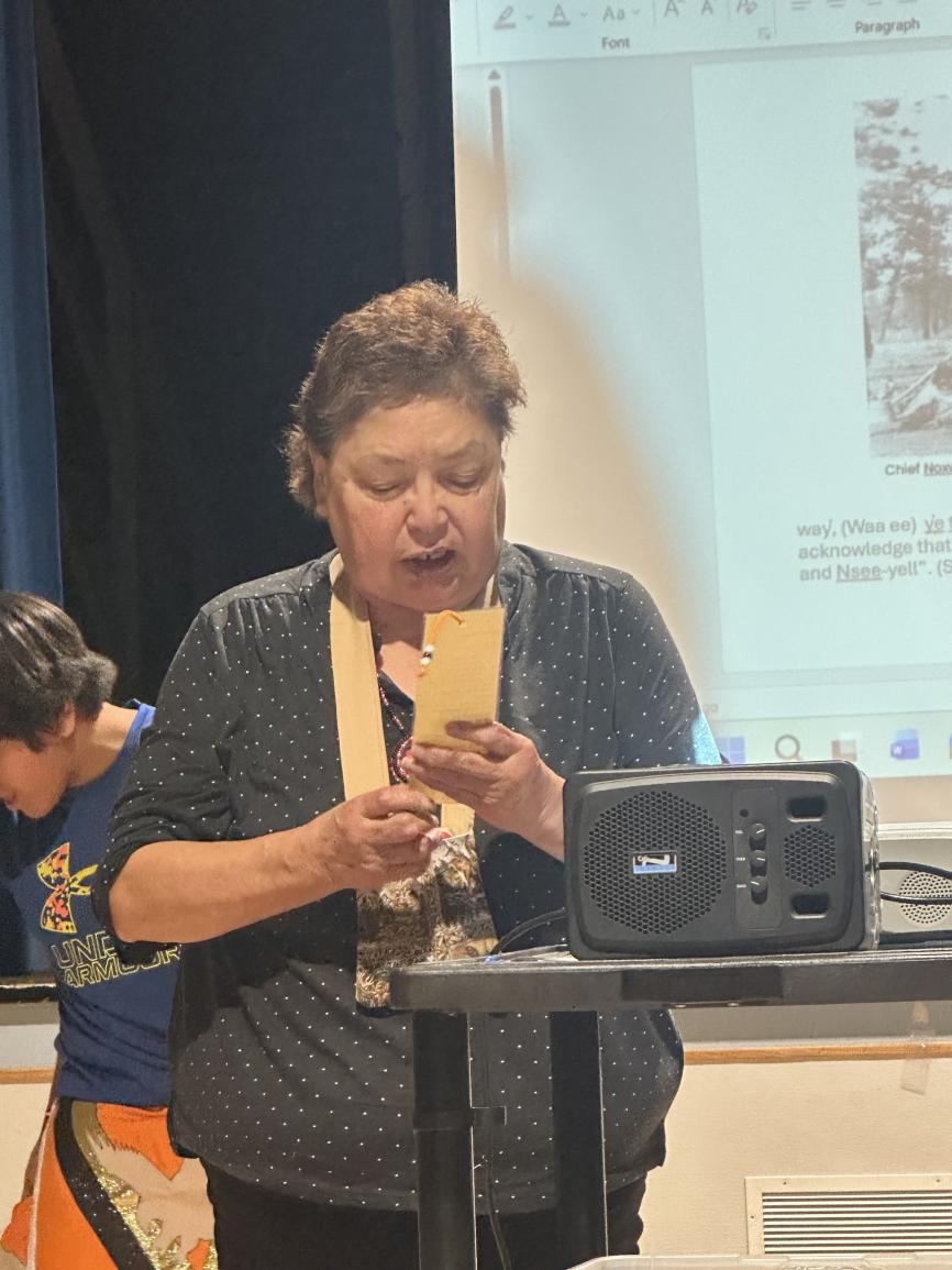 Students proudly shared greetings and land acknowledgments in nłeʔkepmxcín and nsyilxcən, with Ms. Martha offering a blessing in nsyilxcən and Cash sharing the nłeʔkepmxcín blessing in English. Leading up to the event, teachers guided students in learning the meaning of Remembrance Day, and every class created beautiful wreaths to honour veterans and fallen soldiers.
